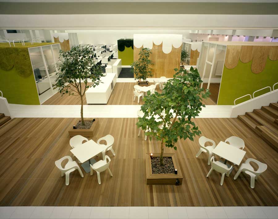 The TBWA Hakuhodo ad agency wanted their office to communicate something to both its employees and clients: “we think differently”. They teamed up with Klein Dytham Architecture to give form to this message, creating one of the most beautiful, playful and relaxing office environments in the world. Once a bowling alley itself, the office’s building still operates a bowling alley, a golf driving range and other entertainment functions above and below the office. The office itself is just as fun as anything else in the building, a tree and grass-lined environment with warm hardwood floors, indirect lighting and an open space that promotes casual living and community.