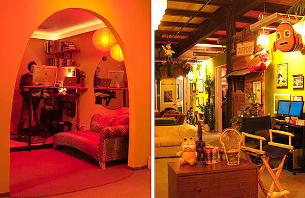 Clive Wilkinson Architects, who had come up with other creative solutions for warehouse spaces, conceived the idea to use shipping containers and large tents to create “breathing islands” inside the warehouse. These self-contained air-conditioned islands of activity provide space for each department within the company and gives them each an identity. Clive Wilkinson’s design for the office received a design award from the AIA in 2002 for creating a lively work environment in a warehouse with reduced energy usage despite a low construction budget.