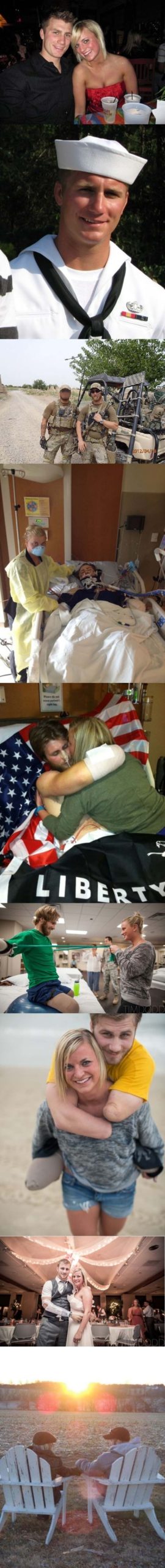Taylor Morris and Danielle Kelly: Naval EOD specialist Taylor Morris, was just 23 when he stepped on an IED. In the aftermath, he lost both of his arms and legs. His girlfriend, Danielle Kelly, also 23, has supported him all the way. When Morris received a Bronze Star with valor from the military, he said at the ceremony: