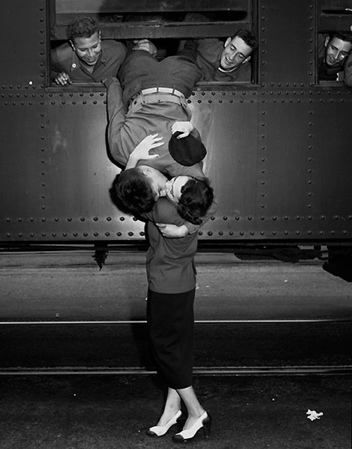 11. California National Guardsman hanging out the window of a train, kissing his wife good-bye, 1950.