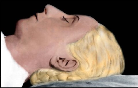 A colored the photograph shows how even in death, Evita is uncomfortably lifelike. She is effectively a wax figure after the mummification process replaced all water in the body with wax.