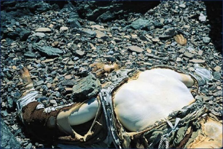 The body was perfectly preserved. Only his clothing was in bad shape, ripped to shreds by the unrelenting wind. While no photos were ever taken of the body’s face, Anker reported that the face was undamaged, a solemn expression remained frozen onto its features. How Mallory died became apparent when a broken climbing rope was found tied around Mallory’s waist, suggesting that Irvin and Mallory were tied together and one of them fell. His ice axe was found just feet from his body leading researchers to believe that Mallory had stopped his own fall but an axe shaped puncture was found on his forehead also suggested that he was killed in the process.