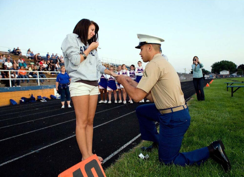 4. Marine Isiah Beauchamp surprises his girlfriend with a proposal during halftime at a game at their old high school.