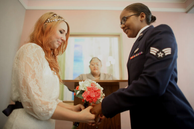 16. A couple holds hands during their wedding ceremony the day after the U.S. Supreme Court ruling on DOMA in New York City, 2013.