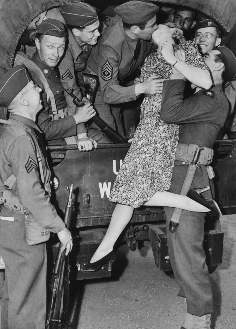 17. Actress Martha O’Driscoll kisses a soldier goodbye in Los Angeles, 1941.