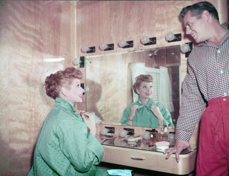 30. Lucille Ball and her husband Desi Arnaz get ready for their closeup, 1955.