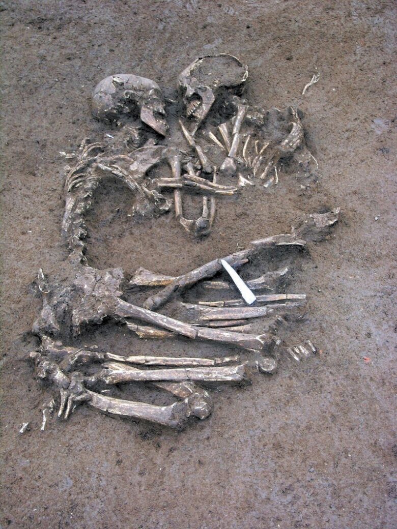 Human skeletons estimated to be 6000 years old, believed to be a man and a woman no older than 20. Found in Valdaro, Northern Italy.