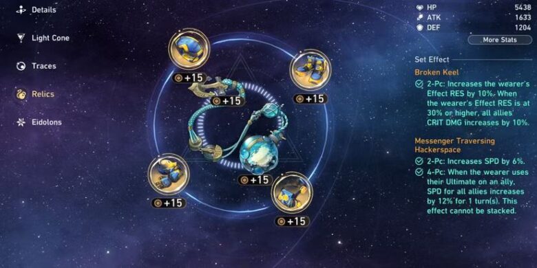 For planar ornaments, use Broken Keel for maximum team damage. This set provides 10% Effect Resistance and increases all allies’ CRIT DMG by 10% when Sparkle has 30% or higher Effect Resistance.