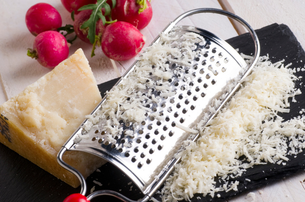 Grate a piece of raw potato. The hardness of the potato along with the oxalic acid will get that cheesy gunk off your grater.