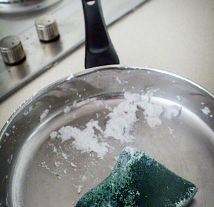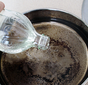 Fill the bottom of the pan with water. Add a cup of white vinegar to the pan. Bring the pan to a boil. Take the pan off the stove and add 2 tablespoons baking soda. Empty the pan and scour.