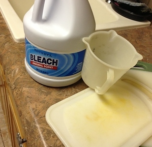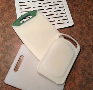 Soak cutting boards in a mixture of bleach and water in the sink for at least an hour. They’ll be good as new!
