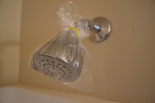 Pour distilled white vinegar in a plastic bag and fit it over the shower head. Secure with a rubber band. Let it soak for an hour, then remove the bag and wipe away with a cloth or paper towel.