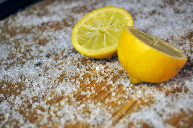 Lemons and coarse salt will work on the wooden and bamboo variety.