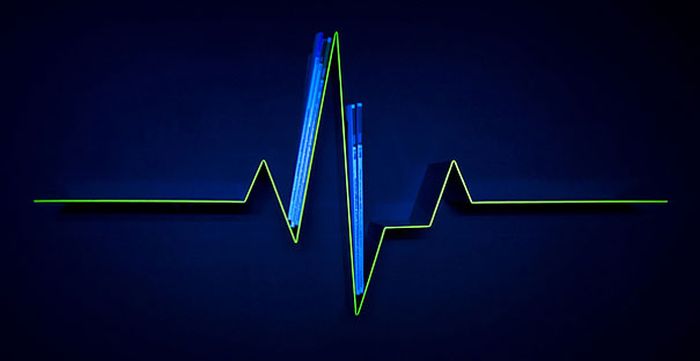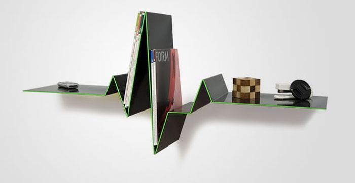 “The source of inspiration is obviously from the well-known shape of a heartbeat. The shelf works both as wall art and as an object to display some magazines and smaller items you like. The edge is painted with a florescent paint that glows in UV light to emphasize the silhouette. ”