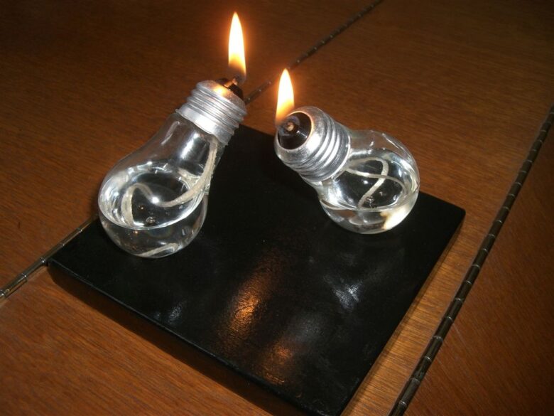 All you need is – a glass cutter, hot glue, stable hanging sticks that are heavy enough to hold the bottles and of course, you need yellow bulbs (please no LED lights).