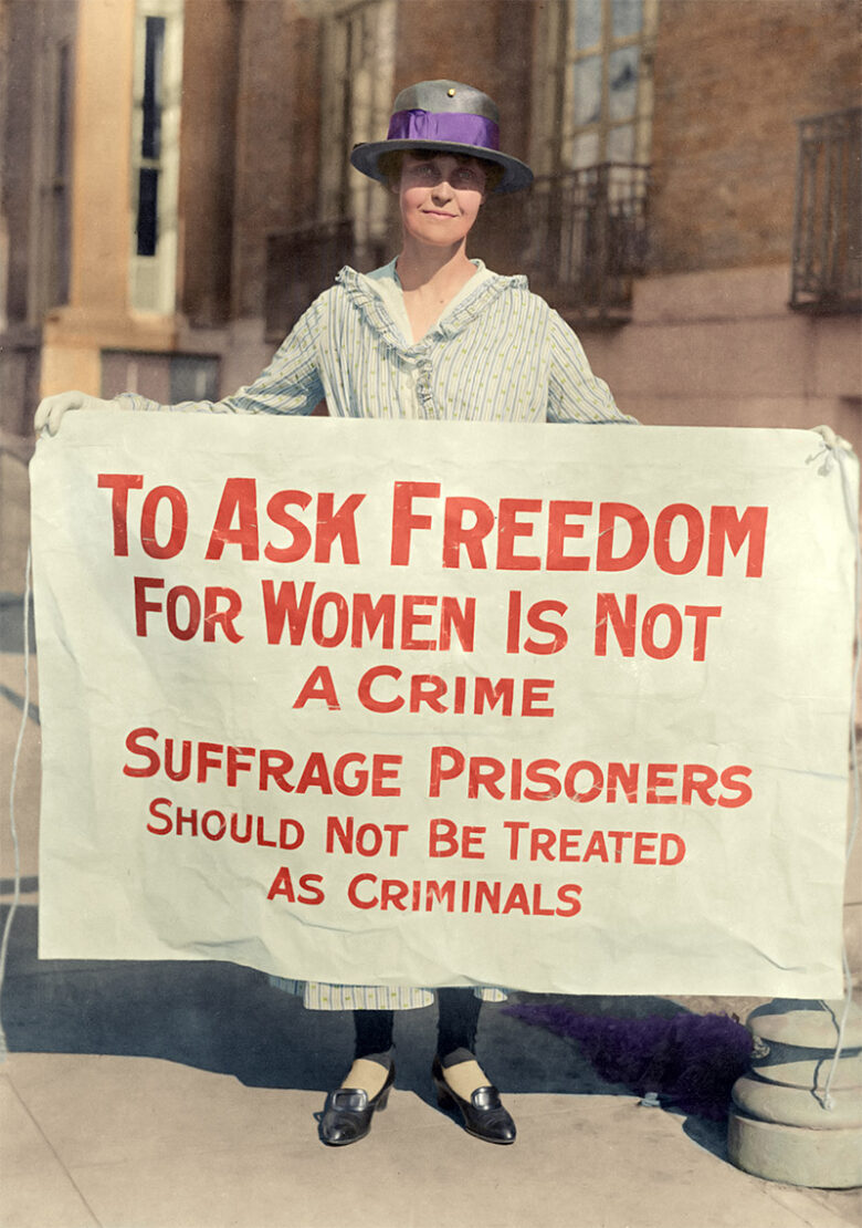 5. Mary Winsor, founder, and president of the Limited Suffrage Society, holds a sign during the American suffrage movement; (ca. 1917)