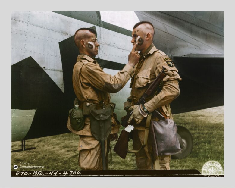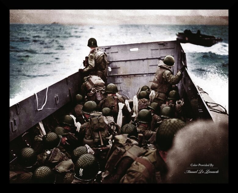 31. Troops crouch inside a LCVP landing craft, just before landing on “Omaha” Beach on “D-Day”, (6 June 1944)